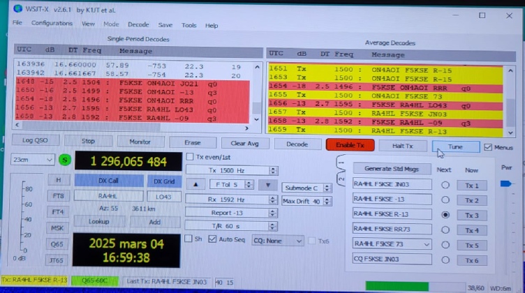 Également entendu notre station voisine et amie F5KUG en CW. Trop près pour ne pas être en direct. (F5KUG 1er Sur 23 cm CW multi op. En 2024 cocorico !)