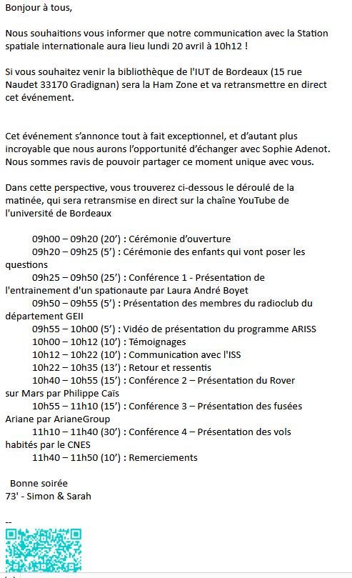 Cette petite démonstration a été l'occasion de faire connaître les activités des radioamateurs. J'espère pouvoir la renouveler lors d'un contact ISS en français en communiquant un peu plus tôt...