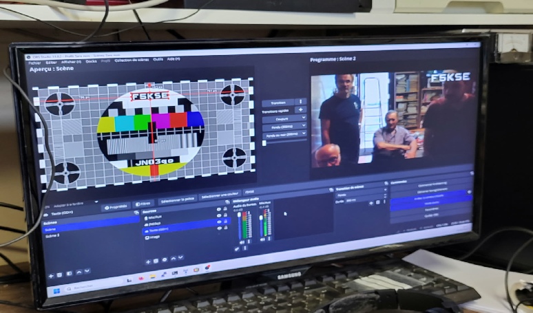 La mire vidéo F5KSE a été transmise via le satellite ainsi que de la vidéo plus son depuis une caméra dans le Radio club (voir photo de l’écran de contrôle). Auto contrôle de nos images par réception depuis QO100.