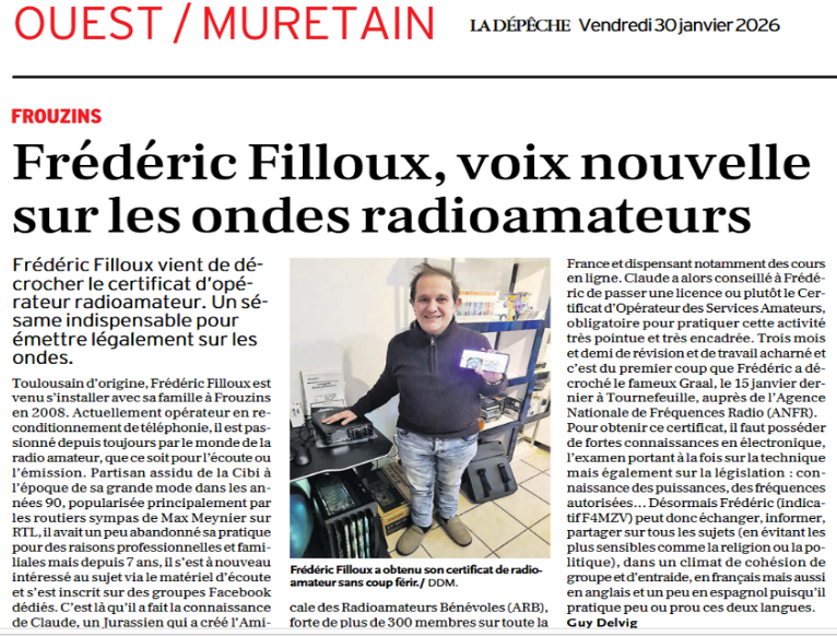 0/02/2026 Félicitations à Frédéric ! Et merci à la dépéche pour son autorisation à publier l’article sur le site et d’avoir rédigé sur le radioamateurisme!