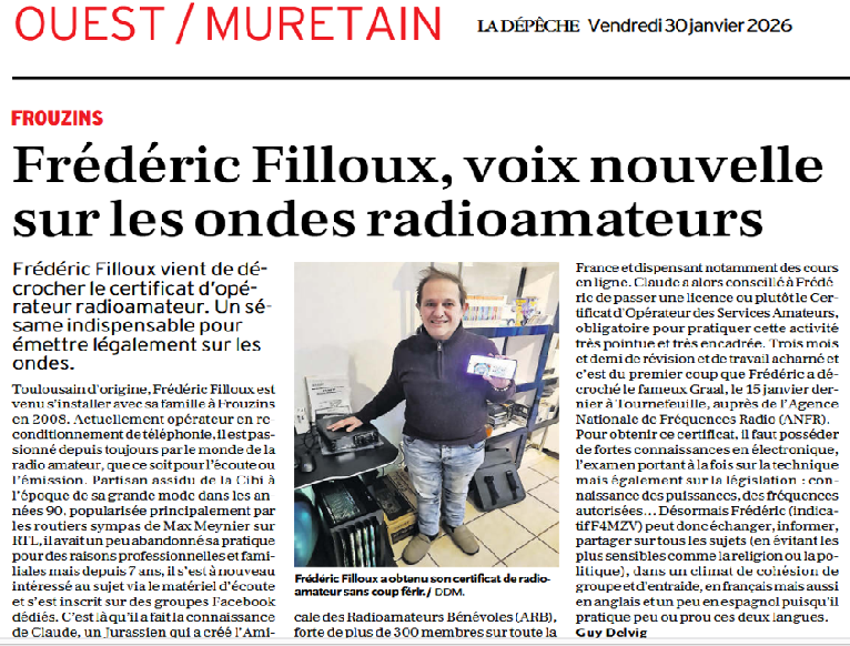 10/02/2026 Félicitations à Frédéric ! Et merci à la dépéche pour son autorisation à publier l’article sur le site et d’avoir rédigé sur le radioamateurisme!