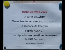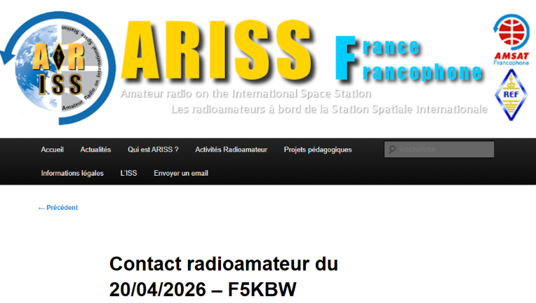 16/04/2026 Contact ARISS en français depuis le 33 F6GUS sera a la maison des citoyens a Pibrac pour écouter en public c’est lundi 20 vers 10h10 locales . Peut être possible d’écouter la voie (X) montante depuis le 31 lien ICI